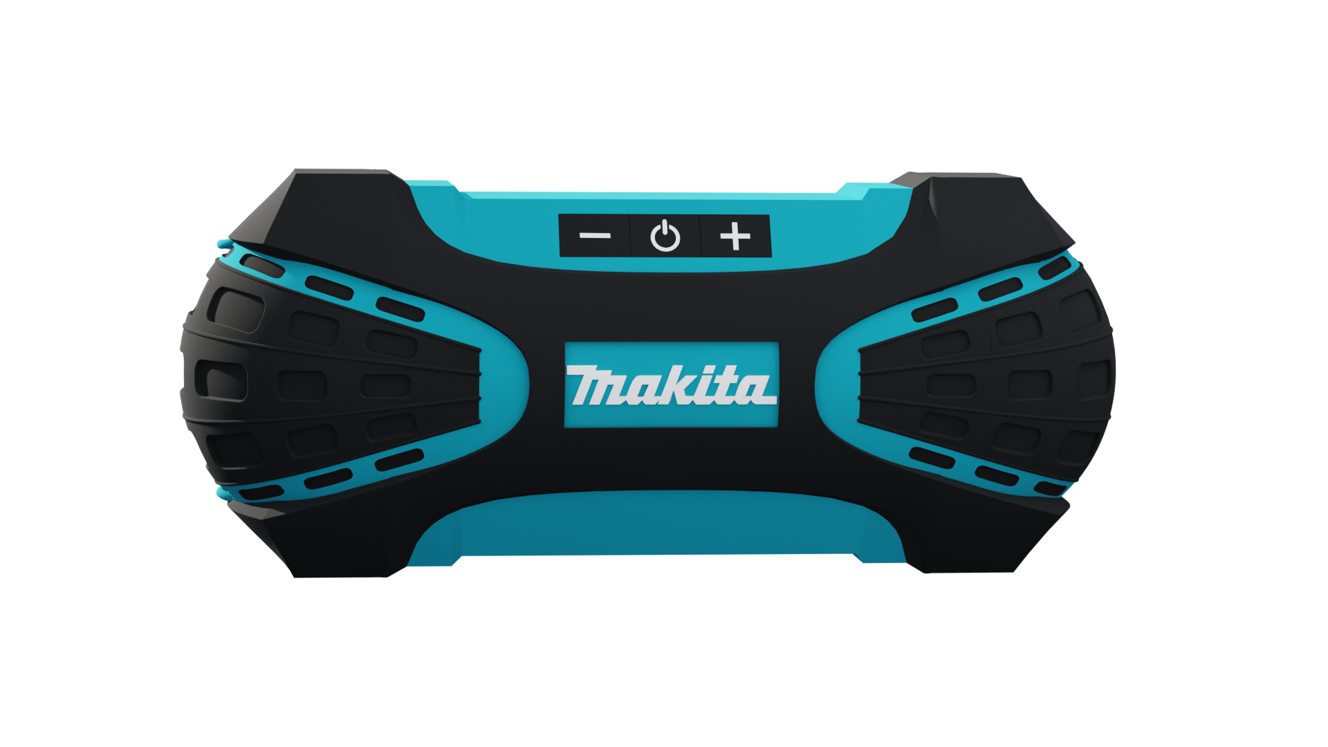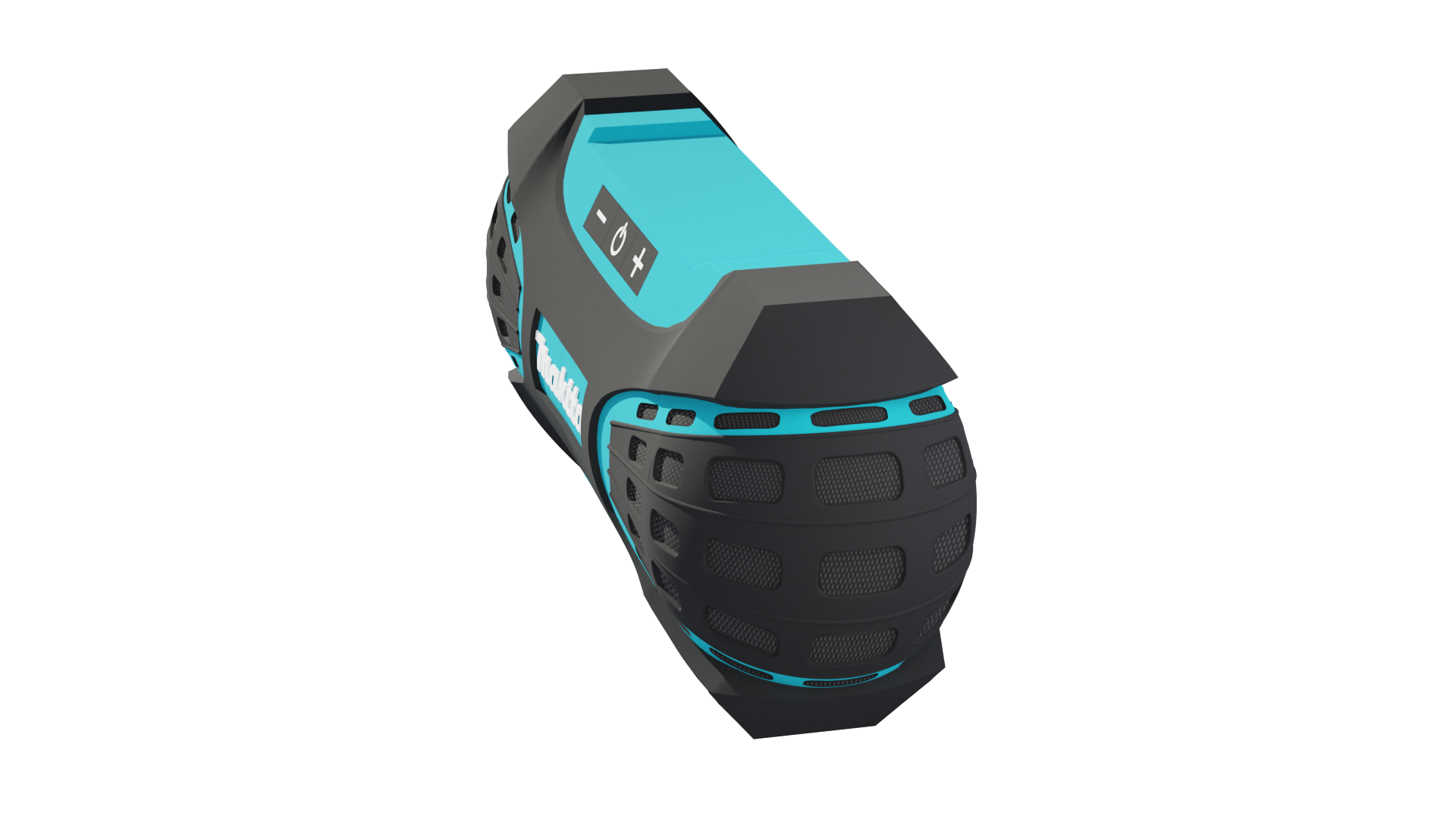 I have designed a Bluetooth speaker based on the Makita brand. The user wants something practical that is of high quality. In order not to complicate the Bluetooth speaker, the functions and therefore the buttons are kept to a minimum. To make the speaker easy to use, it is the right size to be carried with one hand. It also has a device that allows the user to mount the speaker in the environment so that it is not in the way when working.